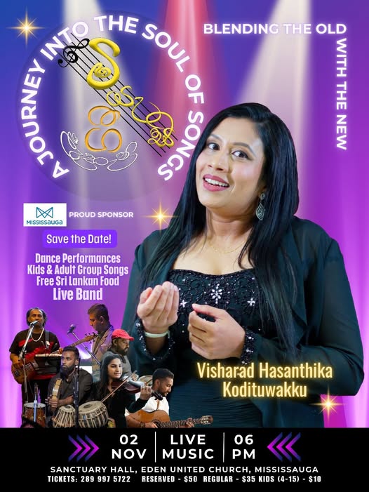 අද ඔබත් එක්ක තොරතුරු බෙදාගන්න යන්නේ ටොරොන්ටෝ සහ අවට ශ්රී ලාංකික ප්රජාව වෙත පමණක් නොව ලෝකයටම මහත් මෙහෙයක් කරන චරිතයක් එක්ක . මේ අපේ ලිපි පෙලේ දී ඔබ හමුවන දෙවන ගායිකාව ඇයයි. කැනඩාවේ ශ්රී ලාංකික පිරිස් වෙනුවෙන් මහත් මෙහෙයක් කරන තවත් ගායිකාවන් රැසක් සිටියදී අප ඇය ගැන මේ මාසයේදී කතාකරන්නේ අගේ සංගීත ජීවිතයේ කැනඩාවේදී පසුකරන විශේෂ කඩඉමක් නිසයි. ඒ වගේම ඔබට කිවයුතු තවත් කාරණාවක් තියෙනවා. අපේ මේ ලිපි පෙලට විවිධ වයස් කාණ්ඩවල, විවිධ ක්ෂේත්ර වල, විවිධ ආගම් සහ දර්ශන අදහන, විවිධ ජාතීන්ට අයත් කැනේඩියානු ශ්රී ලාංකික පුද්ගල චරිත එකතු කර ගන්නේ කිසිදු පිලිවෙලකින් තොරවයි. ඒ වගේම කැනඩාවේ මේ වනවිටත් ක්රියාත්මක වන අපේ සහෝදර පුවත්පත් හරහා ඔබට මුන නොගැසුණු චරිතත් මේ වෙනුවෙන් එක් කරගන්නට අපි හැමවිටම උත්සාහ කරනවා.