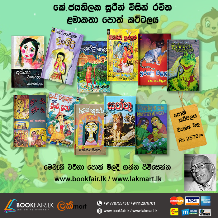 The children’s books of K. Jayathilaka vibrantly describe the relationship between the environment and the child. His children’s books enhance the stable concepts as well as mental reasoning and magical beliefs in children. His books, especially Irunu Balla (Torn Cat) and Oralosuwa Timepiece, help the children to recognize logical relationships in elements and improve their ability to view things from the perspective of others. These books are truly facilitating children to use logic in the concrete operational stage. (As the child psychologist Jean Piaget stated, by the concrete operational stage, children are able to use logic, and this ability can be improved by external support.)
