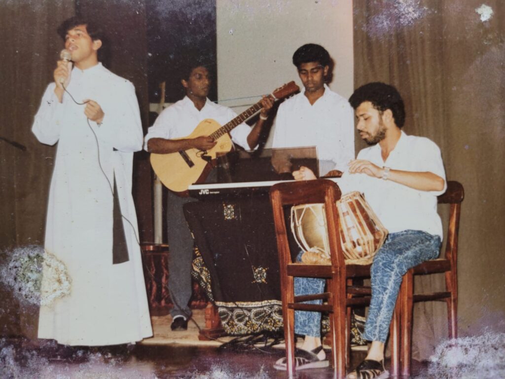 සුළු නිහැඩියාවකින්, ඔහු නැවතත් කතාව පටන් ගත්තා, “මගේ සංගීත ජීවිතයට පල්ලියෙන් තමයි බාහිරින් ලැබුණු ප්‍රබලම බලපෑම ලැබුනේ. අය්යා, ලොකු අක්කා, මම, චුටි අක්කා, පොඩි මල්ලි අපි හැමෝම පල්ලියේ ගීතිකා කණ්ඩායමේ හිටියා. ඒ වගේම කෑගල්ලෙ ඉපදුනු ඉතා ජනප්‍රිය ගායක රූකාන්ත ගුණතිලක සහ සංගීතඥ මහින්ද බණ්ඩාර දෙන්නම මගේ අය්යගේ යාලුවො. රූකාන්ත අය්යා අපේ ගෙදර නිතරම ඇවිත් අය්යත් එක්ක ගිටාර් වාදනය මෙන්ම ගායනයද කළා. එයාගෙන් ලැබුණු ආභාෂයත් මගේ සංගීත ගමනට විශාල රුකුලක් උනා. ඒ වගේම මරීටා ගුණතිලක නම්වූ රූකාන්ත අය්යගේ අක්කා තමයි අපේ පල්ලියේ ගීතිකා කණ්ඩායම මෙහෙය වුයේ. එයත් එක්ක අපි සතියකට වරක් ගීතිකා කණ්ඩායම පුහුණු වෙනවා. ඉංග්‍රීසි ගුරුවරියකගේ පුතෙක් වූ රූකාන්ත අය්යා තමයි මුල් අදියරේ මට ඉංග්‍රීසි ඉගැන්නුවෙත්. වරද්දන කොට මට ගහනවා. මට ඒ ලබාදුන් ඉංග්‍රීසි දැනුමට එයාට මම අදටත් ණය ගැතියි” යනුවෙන් ඔහු හැගීම් බරව පැවසුවා.