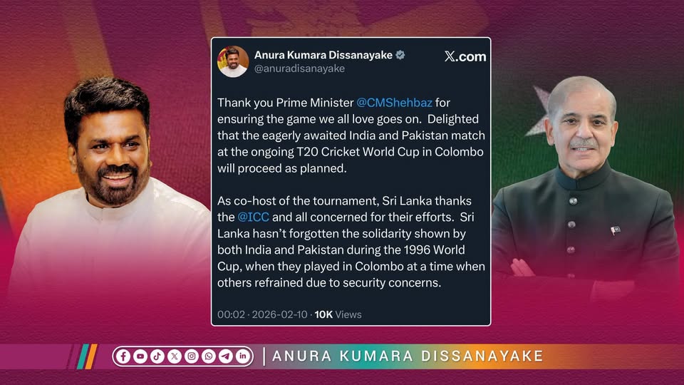 ඉන්දියාව සමග පැවැත්වෙන ක්රිකට් තරගයට සහභාගී වීමට පාකිස්තාන ක්රිකට් කණ්ඩායම තීරණය කිරීම සම්බන්ධයෙන් සිය ස්තූතිය පළකරන බව ජනාධිපති අනුර කුමාර දිසානායක මහතා සිය නිල X ගිණුමේ සටහනක් තබමින් පවසයි.