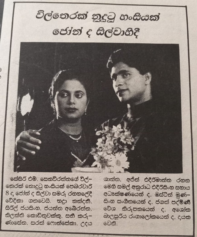 1991 වර්ෂයේ අගෝස්තු මාසයේ 01 දා සහ 02 වෙනිදා ලුම්බිණී රගහලේ පැවති  මංගල දර්ශනයෙන් ආරම්භ වු “විල් තෙරක් නුදුටු හංසියක්” නම්වූ නාට්‍යයේ රචකයා සහ නිෂ්පාදකයා වනුයේ සේසිරි එම්. සෙනෙවිරත්න කලාකරුවා. නාට්‍ය වාර 50 ක් පමණ රඟ දැක්වූ මෙම නාට්‍යය, පසුකාලීනව කාල පරිච්චේද දෙක තුනක් පසුකරනා අතරේ එහි නමද කිහිප වතාවක් වෙනස් වුවා. ලංකාවේදී, මෙම නාට්‍යයට සංගීතය සැපයුවේ ප්‍රතිභාපුර්ණ සංගීත ශිල්පී ඔස්ටින් මුණසිංහ කලාකරුවා. 2026 මැයි මස 16 වෙනිදා කැනඩාවේදී, සමන්ත කරුණාරත්න “සඳ නොදුටු සඳ” නමින් නිෂ්පාදනය කර රඟ දක්වන්නේ “විල් තෙරක් නුදුටු හංසියක්” හි තෙවැනි නිෂ්පාදනයයි.