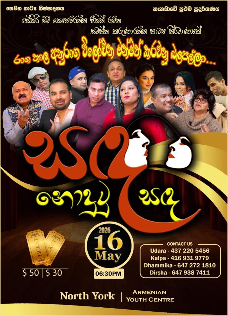 2026 වසරේ, මැයි මස 16 වෙනිදා සන්ධ්‍යාවේ, 6.30 ට කැනඩාවේ Armenian Youth Centre හිදී, ශ්‍රී ලාංකික කැනේඩියානු පොළොවට අස්වද්දන “සඳ නොදුටු සඳ” දැක ගැනීම සඳහා කැනඩාවේ ශ්‍රී ලාංකික සමාජයට ආරාධනා!